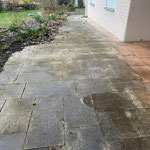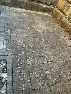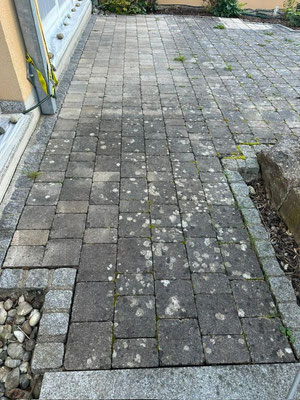Hier war die komplette Einfahrt in einem sehr schlechten Zustand. Flechten und Moos im gesamten Bereich. Hier war zunächst erstmal eine Grundreinigung nötig.