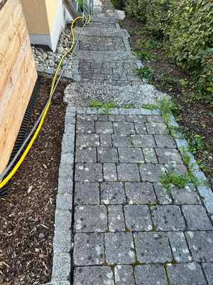 Dieses Projekt beinhaltete verschiedene Flächen um das Haus. Wie auf den einzelnen Bildern zu sehen, waren alle Zwischenräume mit Moos und Unkraut besetzt.