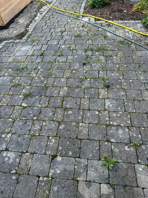 Der Monat Juni beginnt u.a. mit einer größeren Herausforderung. Ein Pflasterweg mit besonders breiten Fugen, die allesamt mit Moos und Unkraut bewachsen wahren.